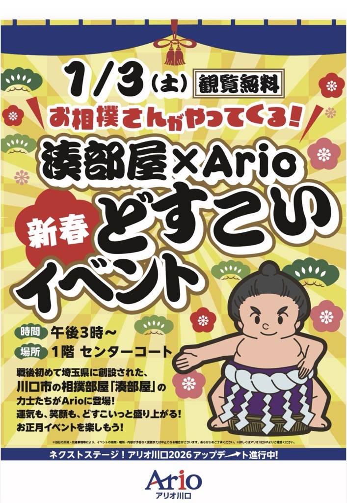 1月3日(土)にアリオ川口にて、イベントを開催いたします。観覧無料ですので、ぜひお越しください。